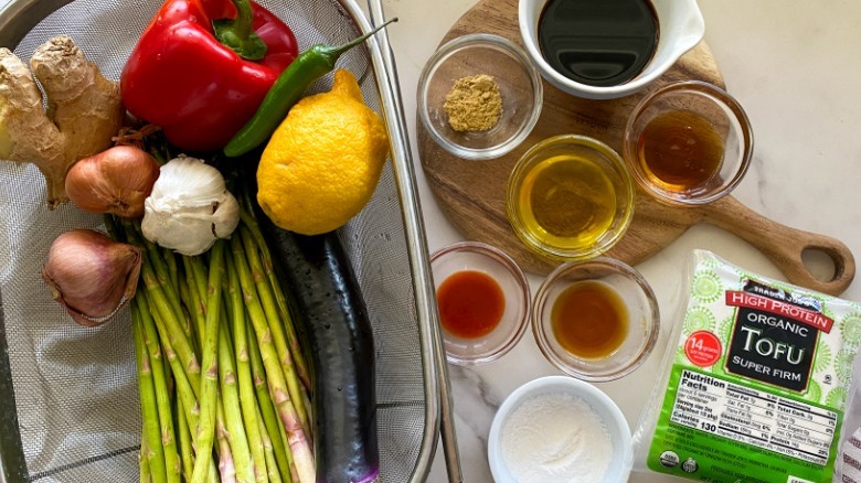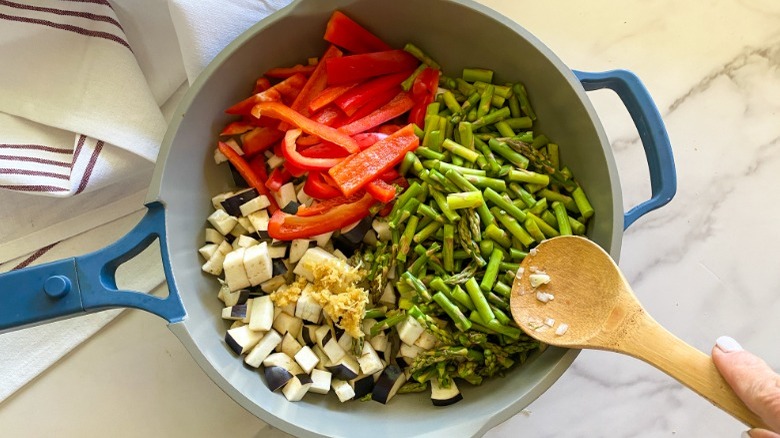 - Add another tablespoon oil to the pan you cooked the tofu in then add the shallots, garlic, and pepper. Saute for 5 minutes before adding the eggplant, asparagus, red pepper, and ginger. Sauté on medium for 10 minutes.
