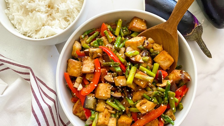 When it comes to weeknight dinners, stir fries are a favorite because they include healthy vegetables and you can throw them together quickly — an absolute necessity for busy weeks! Wellness coach and recipe developer Miriam Hahn brings us this recipe for spicy Chinese eggplant stir fry and says, "I try to eat a wide variety of vegetables, and eating all of the colors is super important because they all offer different benefits. I love Chinese eggplant because it's got bright purple skin full of powerful antioxidants, and the Chinese version has thinner skin, making it easier to eat without the bitterness that American eggplant has with its thicker skin. I bring some other colors in this stir fry using asparagus and red pepper, but you can feel free to use any other vegetables you prefer. Stir-fries are a great way to use up extra vegetables you have in your fridge." Read on to learn how to make this delicious stir fry you can whip up in under an hour.