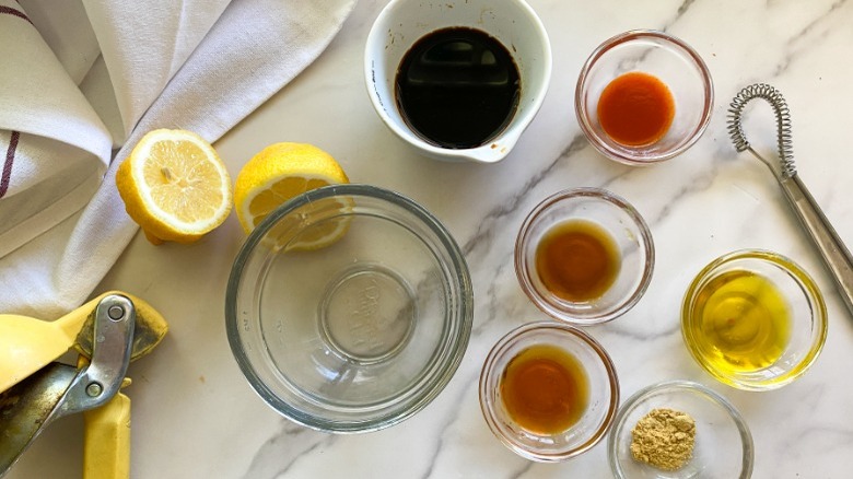 - While that's cooking, combine ¼ cup soy sauce, 2 tablespoons olive oil, lemon juice, maple syrup, sesame oil, sriracha, and ground ginger in a small bowl. Dissolve the remaining cornstarch in a small amount of hot water, then add it to the bowl,