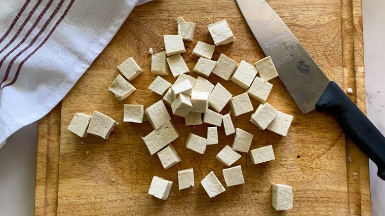 - Add 1 tablespoon oil to a non-stick frying pan, bring the heat to medium, and drop in the tofu. Let it cook undisturbed for 10 minutes, then flip each cube over and cook for 10 more minutes. (Alternatively, you can cook the tofu in the air fryer for 15 minutes at 400 F) Remove it from the pan.