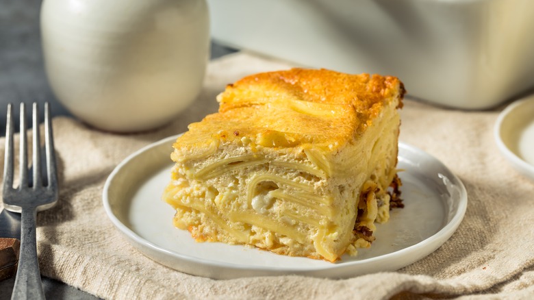 As Gil Marks, author of the "Encyclopedia of Jewish Foods," put it, "To know a community is to know its food." While this is true of any community, if you've ever had the supreme pleasure of biting into a soft latke, plush babka, or tangy gefilte fish, then you know what a special pocket of the culinary world Jewish food is. Today, we're deep-diving into one particularly popular traditional Jewish dish with a long history behind it. There's potato kugel, challah kugel, zucchini kugel, and more. But we're talking about arguably the most popular kind — noodle kugel — and its tangled-up origin story.