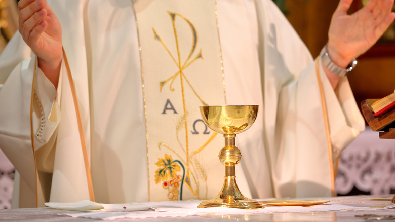 Sacramental wine, also known as altar or communion wine, is an extremely important component of Catholic Mass. As we see in "Matthew" 26: 27-28, while at the Last Supper, Jesus took a cup of wine and said: "'Drink from it, all of you, for this is the blood of my covenant, which will be shed on behalf of many for the forgiveness of sins.'" Thus Jesus shared the first communion among the disciples. The practice has continued in Catholic Mass ever since.