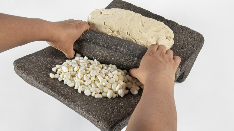 Before grinding, corn must be soaked and cooked in an alkaline solution, a process called nixtamalization, from the Nahuatl word for processed corn dough. Without this step, the niacin and other nutrients present in the corn cannot be absorbed by our bodies. Indigenous Americans nixtamalized their corn in a solution of water and wood ash or seashell ash in coastal areas. When corn was introduced as an alternative staple in Europe, populations who attempted to grow it suffered from pellagra, a disease caused by niacin deficiency until they learned how to process the grain.