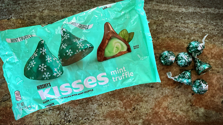 If you enjoy dark chocolate mint candies like York Peppermint Patties and Junior Mints, then you're going to absolutely lose it over Hershey's Kisses Mint Truffle. This seasonal Kisses flavor has an outer solid dark chocolate layer with a soft, cool mint truffle filling — and wow, does this combo work for us. Like Hershey's other seasonal products, Mint Truffle has a festive appearance. Wrapped in attractive green foil with a snowflake motif, the filling is bright green. (Come to think of it, some of these Kisses would be especially cute tossed in a stocking next to those red and white striped Candy Cane Kisses.)