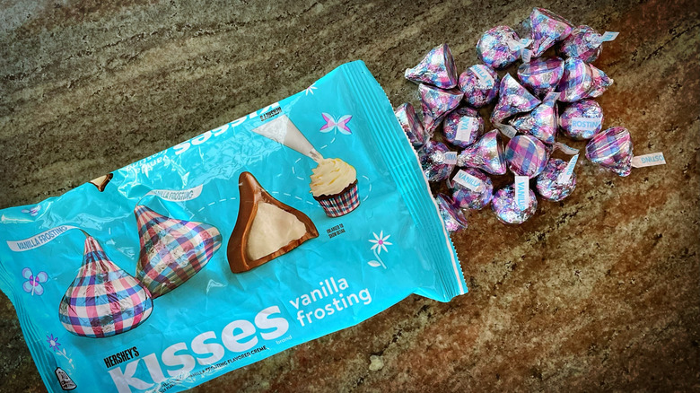 At stores in plenty of time for Easter and other spring holidays, Hershey's Kisses Vanilla Frosting tastes an awful lot like a typical store-bought frosting-laden chocolate cupcake. This isn't necessarily a bad thing, assuming you enjoy this pairing. Overall, we think that filled Kisses flavors (including this one) possess a nice texture juxtaposition with their solid outer shell vs. creamy inner filling. That said, the overall flavor result varies depending on the filling type. In this case, chocolate and vanilla go perfectly well together (obviously) — but if you don't generally care for VERY sweet vanilla frosting, we recommend steering clear of these Kisses.