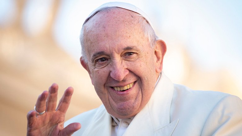 Given how closely guarded he is, no one would blame you for thinking that the leader of the Catholic Church subsists on an austere diet of bread, fish, and vegetables. While it is true that Pope Francis mainly eats a simple diet composed of baked chicken, salad, fruit, and (some) wine, there's more to his diet than meets the eye. For one, he loves the food of his adopted home in Rome, in particular pasta and pizza. Unfortunately, he doesn't get to eat either one that often. Vatican doctors urged him to cut back on pasta for health reasons, and grabbing a slice of pizza at the local pizzeria when you're the pope? Not gonna happen.
