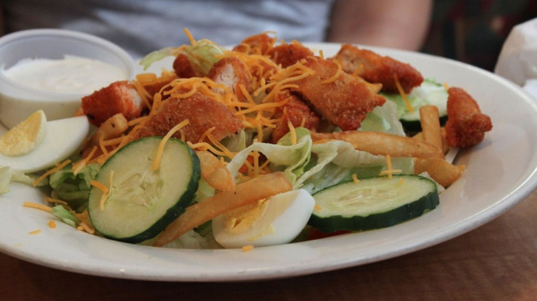 Once you leave the immediate area, however, a Pittsburgh salad is going to be more difficult to find. Fortunately, it shouldn't be difficult to customize your own wherever you are. Simply order a salad with your choice of meat, a side of french fries, and dressing on the side. You could also request a dish of shredded cheese if you're going all in. Assemble the sides on your own, and — boom — you've got a western Pennsylvania specialty. If you get strange looks, just brush them off the way they do in Pittsburgh and pity those munching on their nice, light salads.