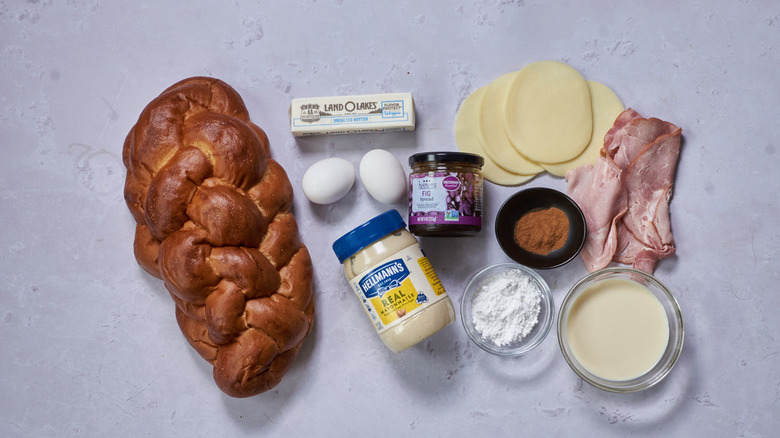 In addition to the bread, you'll need mayonnaise, fig jam, provolone, and ham to make the sandwiches; eggs, milk, and cinnamon to dip them in; and butter to fry them in. You'll then finish them off with a sprinkling of powdered sugar.