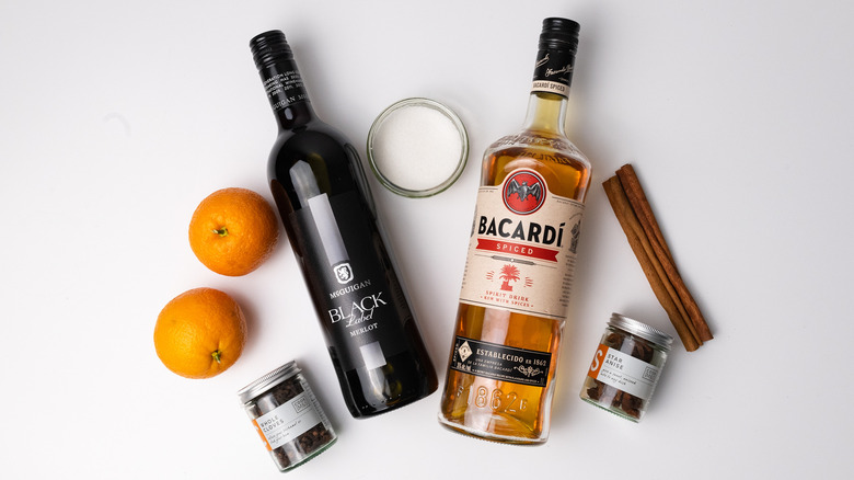 - Add the red wine, spiced rum, remaining orange slices, cinnamon sticks, cloves, star anise, and the granulated sugar to a medium-sized saucepan.