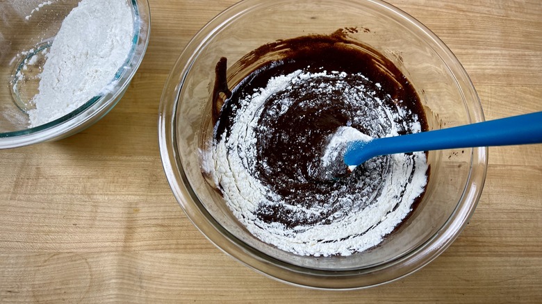 Once the chocolate is melted, it was time to combine the remaining liquid ingredients before adding the dry ingredients. We added the salt, sugar, and brown sugar while the butter was still hot, as the temperature would help melt the sugar and infuse every bite with an equal level of sweetness. After that was all incorporated, we added the full-fat yogurt and egg, letting the mixture cool down slightly just in case the heat caused a curdling effect.