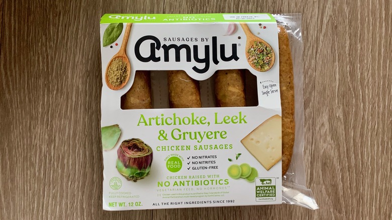 When we saw the creative, highly intriguing flavors of Amylu's No Antibiotics Chicken Sausages available, we had to choose the most unexpected one of all: the Artichoke, Leek, and Gruyere. We rarely think of leeks, um, at all, which is entirely on us. But we could never even begin to fathom putting them in sausage. Artichokes, meanwhile, are personal favorites, and you can't offer us a much more appealing cheese than gruyere. How would the brand do all those flavors with a baseline sausage, plus incorporating such innovative elements?