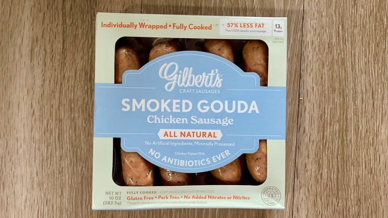 Smoked gouda seems like the absolutely perfect cheese to go with the smokiness of a good sausage. When we picked up a package of Gilbert's to add to our taste test, we decided to see how well the brand navigates flavors by sampling the Smoked Gouda Chicken Sausage. Luckily for us, Gilberts does indeed craft a nice link with plenty of cheesy flavors.