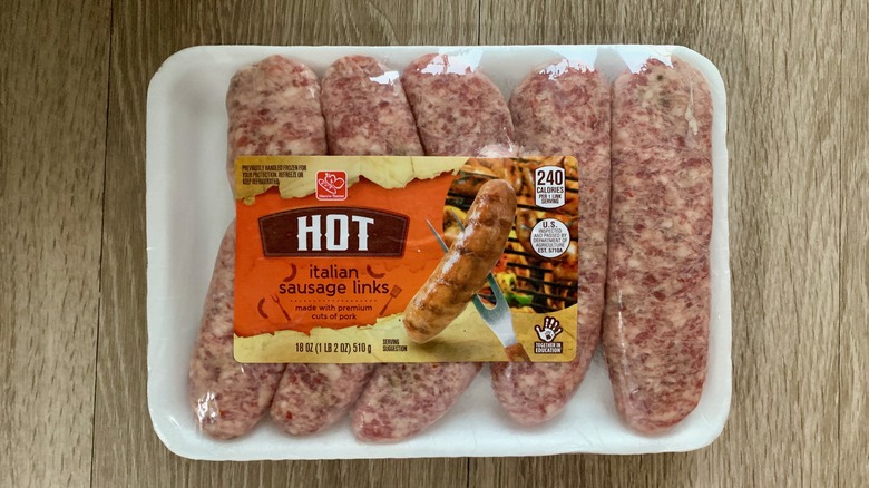 Italian sausages come in many forms and flavors. They're a great blueprint for riffing and customizing. You'll probably see a mild, sweet, and hot option in your everyday grocery store. To keep this taste test on its toes, we chose to analyze Hot Italian Sausage from our local Harris Teeter. We like the way this chain's store brand is usually a cut above, so we were interested to see how its sausages hold up to both the fancier craft brands and the big-name basics on the list. The verdict: It's just as we'd thought. This is a great lower-priced dinner sausage for your every need, from straight-up on a grill to folded into a hearty, soul-warming white lasagna. If it's not grilling season or you're just looking to try a different cooking approach, we think that these sausages would hold up really well to boiling (which is perhaps our favorite way to prepare all our sausages).