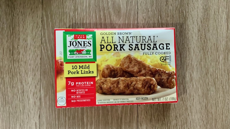 As far as we're concerned, after this taste test, Jones Dairy Farm's All-Natural Golden Brown Pork Links is the gold standard of tasty, affordable, accessible, and approachable breakfast sausage. They're everything you need, and though they probably won't be the star of the show, they check the boxes with ease. First of all, they're made with all-natural ingredients and free from preservatives, which is a breakfast boon. Yet even without those preservatives, they're fully cooked, and even easier to fry up than your eggs. Each link has a spot-on flavor and texture, plus both a savory and slightly sweet flavor perfectly balanced with a barely-there blend of spices. The texture is juicy and tender, neither dry nor spongey. Obviously, Jones frozen sausages aren't the most luxurious, but for what you're getting, the getting is good.
