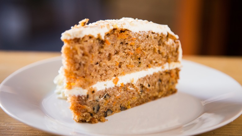 One of the most common mistakes everyone makes with cake is underbaking it. Since carrot cake is naturally moist and brown in color, many cooks remove the cake from the oven prematurely, thinking it's finished baking — when in reality, it's entirely raw inside. Instead, you should bake the cake at the temperature and the time listed in the recipe, taking into account the size of the pan (cupcakes bake faster than cake) and its color (dark pans tend to absorb more heat and bake quicker than lightly-colored pans).