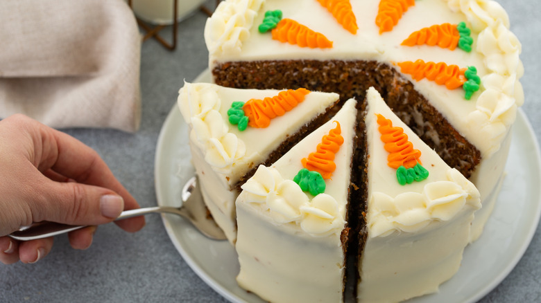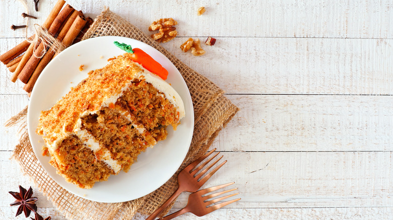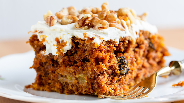 Although the star of the show is the carrot, carrot cake is inherently also a spice cake. This means you have to get creative with the spices you add to the mix to add a bit of heat and flavor to your dessert. The most common spices found in carrot cake are warming spices like cinnamon, nutmeg, and cloves. But chef Ina Garten elevates her carrot cake with the addition of candied crystallized ginger. She adds this ingredient, which is made by candying ginger in simple syrup, to a mascarpone cheese frosting.