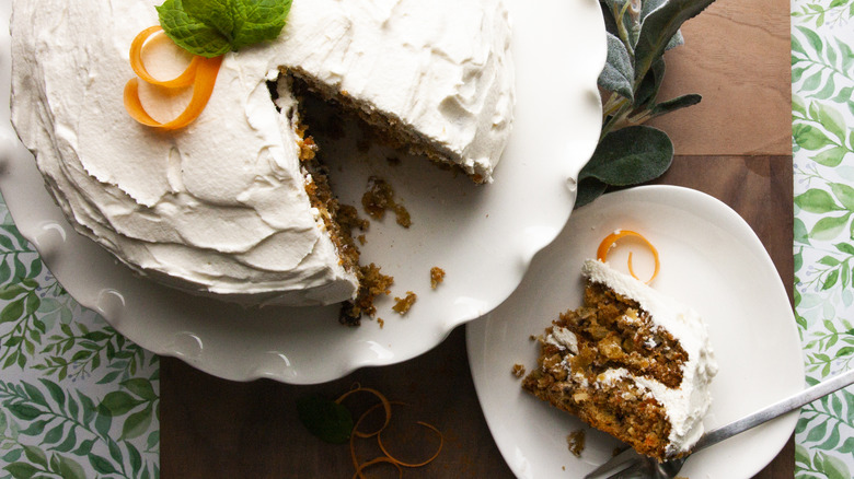 You can also incorporate orange into your carrot cake as a garnish. Candied orange peels can be made with three ingredients: oranges, water, and granulated white sugar. First, peel the orange using a standard vegetable peeler and slice it into ¼-inch pieces. Then, boil and rinse the peels before simmering them in the simple syrup for at least an hour. Once you've removed the peels from the syrup, you can dry them and sprinkle them atop your homemade carrot cake.