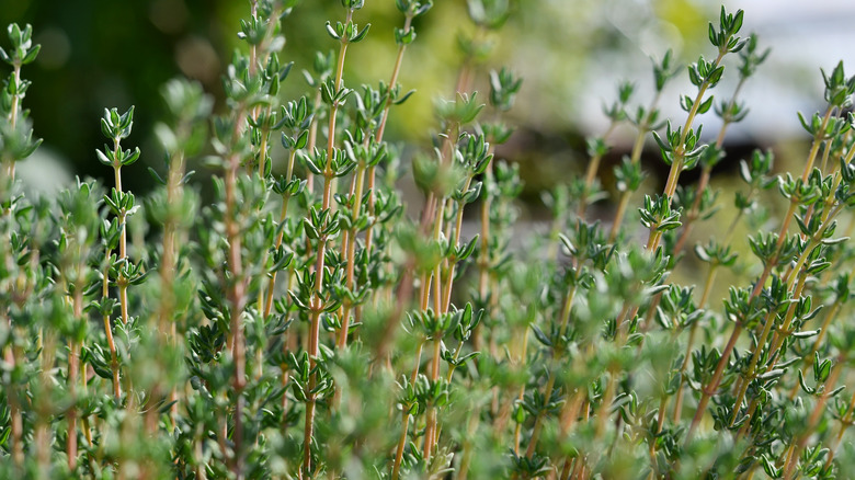 Thyme is often described as pungent, having a sharp and spicy taste that is used in both Italian cooking and Mediterranean dishes. While most fresh herbs are typically added at the end of cooking a recipe, thyme is a hearty herb that actually needs a longer cook time to impart its taste on whatever you are conjuring up on your stovetop or in your oven. Of course, thyme is also a bit of a time suck when it comes to removing those little herby green leaves from the stems that hold them. However, there's always a solution to life's cooking conundrums and luckily, Rachael Ray explains what you should look for when using fresh thyme to make this task a little easier.