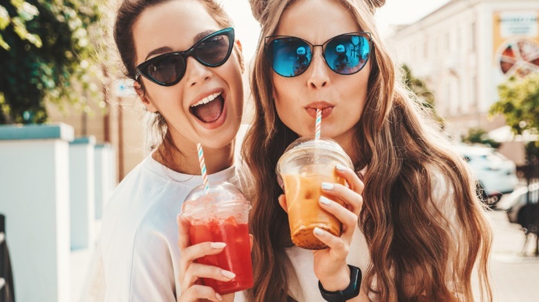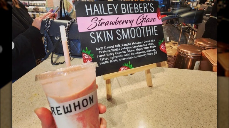 But maybe even more notable are the celebrity smoothies. Hailey Bieber's Strawberry Glaze smoothie, priced at $18, is full of skin-loving ingredients like collagen, super-trendy sea moss, hyaluronic acid, strawberries, and almond milk. Not only are fans raving that it tastes sumptuous and dessert-like because of the sweet strawberry glaze addition and creamy coconut, but it makes for a pretty stunning selfie, as well. Previously, Bella Hadid's Orange Creamsicle smoothie featured her own non-alcoholic beverage brand, while the Kourtney Kardashian Poosh Potion Detox smoothie was loaded with activated charcoal, blueberries, and avocado.