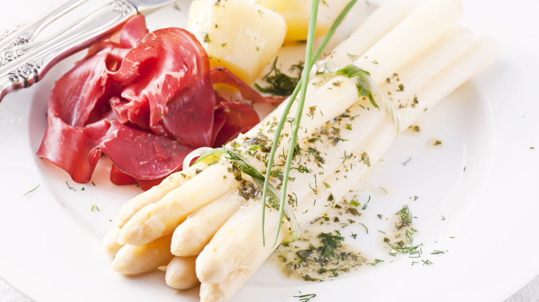 Throughout Germany, white asparagus is served alongside regional favorites like schnitzel, bratwurst, or potatoes, used to spruce up soups and salads, or drizzled with hollandaise sauce. But it is most commonly served simply with butter and ham, per The Guardian.