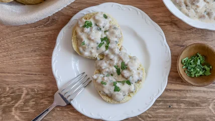 Place a halved biscuit on a plate and slather on that gravy, followed by some fresh parsley, if desired. While biscuits and gravy is a full (and filling) meal on its own, Morone does have some serving suggestions. "There are lots of things you can pair with biscuits and gravy, like eggs, potatoes or fruit," she says. "Any side dish you like will go with this."