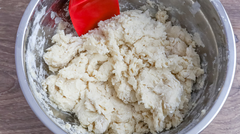 Now, grab a small bowl and whisk together the Greek yogurt, ¼ cup of milk, and the egg. Morone stresses the importance of avoiding room-temperature dairy products when making the biscuit dough and says, "For this recipe you want the butter, yogurt, and milk all to be cold." She goes on to explain, "This helps the biscuits to rise high, and be flaky rather than greasy." Pour the wet ingredients into the bowl with the dry ones, then mix until you have a shaggy dough. Finally, use your hands to work the dough into a ball.