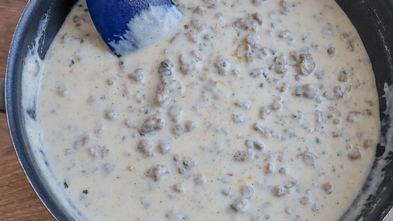 Next up, slowly add in 2 ½ cups of milk, then bring the mixture to a boil. Cut the heat and bring the mixture to a simmer, and keep it there for about 5 minutes, or until your gravy reaches that thick, well, gravy-like consistency. And, if it ends up a bit too thick, don't sweat it: "If you cook it until it gets too thick and you want it thinner, just add extra milk a tablespoon at a time until you reach your desired consistency," Morone advises. Give it a taste and add any extra seasoning as desired.