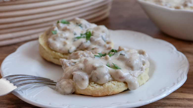 As for the gravy, you'll need breakfast sausage, a bit more flour, milk, and salt, black pepper, sage, garlic powder, crushed red pepper flakes, and some nutmeg. "I also used nutmeg in the gravy to round out the flavor of the gravy better and crushed pepper to give it a little bit of extra flavor," says Morone. And, to add brightness and a final herbal touch to the dish, you can optionally garnish your plate with some chopped parsley.