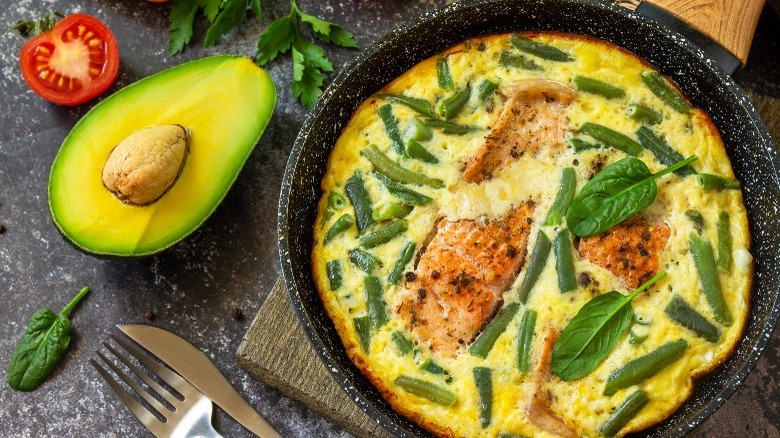 If you're looking for a healthy rendition of your favorite brunchtime dish, be sure to reach for a crustless spinach and salmon quiche. You'll appreciate the sweet onion and shallots mixed in with the egg, spinach, and cheddar cheese. Instead of the calorific heavy cream addition, this recipe uses half and half to cut down on fat.