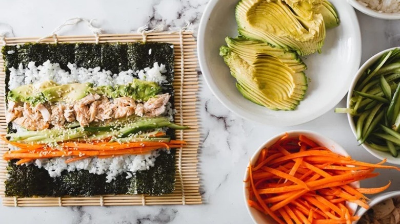 Sliced avocado, cucumbers, carrots, and a few other ingredients will make their way into these tasty rolls. For a bit of a spicy (and delicious) touch, don't leave out the spicy mayo made with mayonnaise and sriracha. Serve with wasabi, pickled ginger, and soy sauce, and you have a restaurant-worthy meal before you.