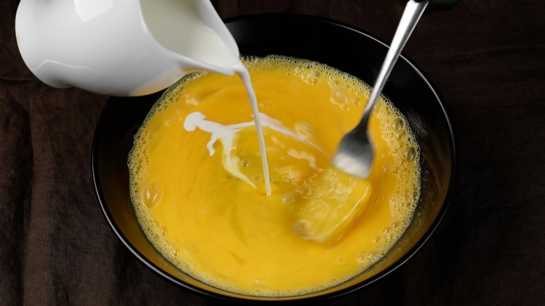 While many recipes advise whisking together all your scramble ingredients before cooking, by withholding some of the cold components until the eggs have just begun to set, you'll immediately lower the temperature in the pan, allowing your eggs to scramble more gradually, helping you to achieve optimal creaminess. Gordon Ramsay's simple trick to prevent overcooking eggs is to wait to add the crème frâiche, heavy cream, or butter until your eggs are about halfway cooked.