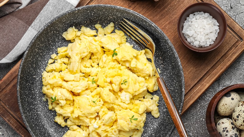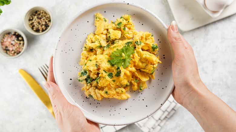Many cooks believe that the way food is served can be just as important as the way it's prepared. So, how should you serve your scrambled eggs? Chef Alton Brown and Martha Stewart both strongly advocate for serving scrambled eggs on a heated plate. Transferring your scrambled eggs to a heated plate ensures your eggs won't dry out or turn cold before you've begun eating. Additionally, the warmth from the dish allows you to remove your scramble from the pan before it's finished cooking without having to worry about your eggs being underdone. According to Alton Brown, your scrambled eggs will arrive at the right consistency while on the heated plate so that you can focus on enjoying your meal.