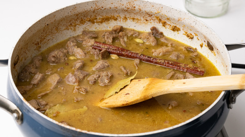 - Add the lamb back to the pot, along with the lamb stock. Set the pan to simmer and let the lamb slowly cook for an hour, stirring occasionally. If the pan runs low on liquid, add a little more water or stock. At the end of the hour, there should be roughly 1 cup of liquid in the pan along with the lamb.