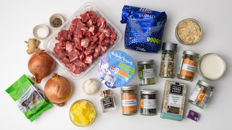 To make this celebratory lamb biryani recipe, first you will need to gather the ingredients. You will need onions, garlic, ginger, almonds, ghee, chopped lamb shoulder, lamb stock or broth (you can follow our lead and use a bouillion cube), rice, milk, yogurt, dried cranberries, and salt and pepper. From your spice rack you will additionally require garam masala, cinnamon, cardamom, cumin, coriander, cloves, bay leaves, and saffron.