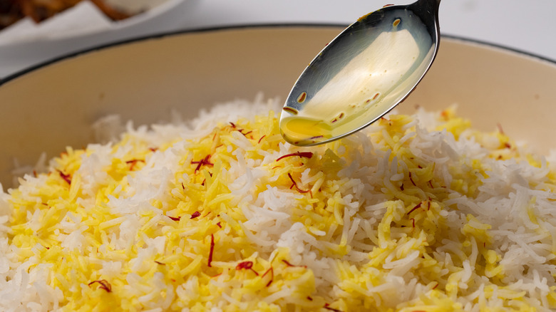 - In a large, ovenproof casserole dish, layer up the lamb mixture and then the rice on top. Drizzle the saffron-infused milk over the top of the rice in streaks, and similarly, drizzle the remaining 2 tablespoons of ghee. Add roughly half the fried onions on top, and then place the lid on the casserole dish and seal the edges with tin foil.