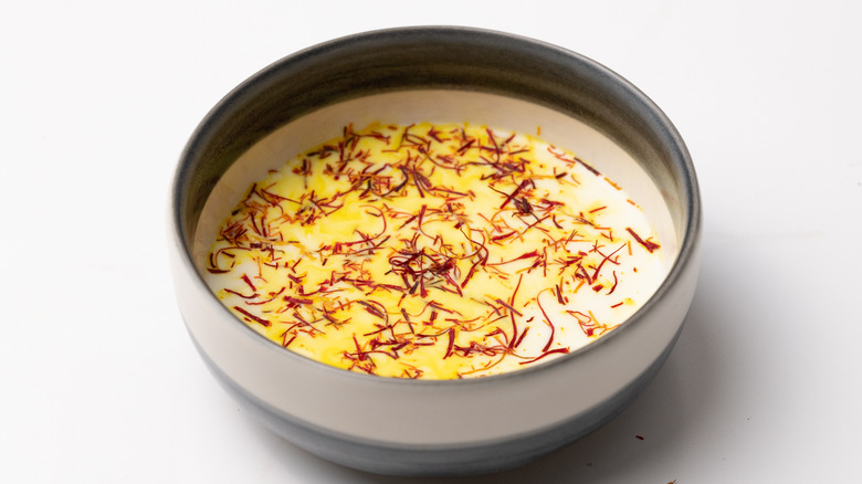 - While the lamb cooks, heat up a small pan over low heat. Add the threads of saffron to the pan for a few seconds, and then remove them and add them to the warmed milk. Stir the saffron into the milk and then set it aside to infuse for 30 minutes.