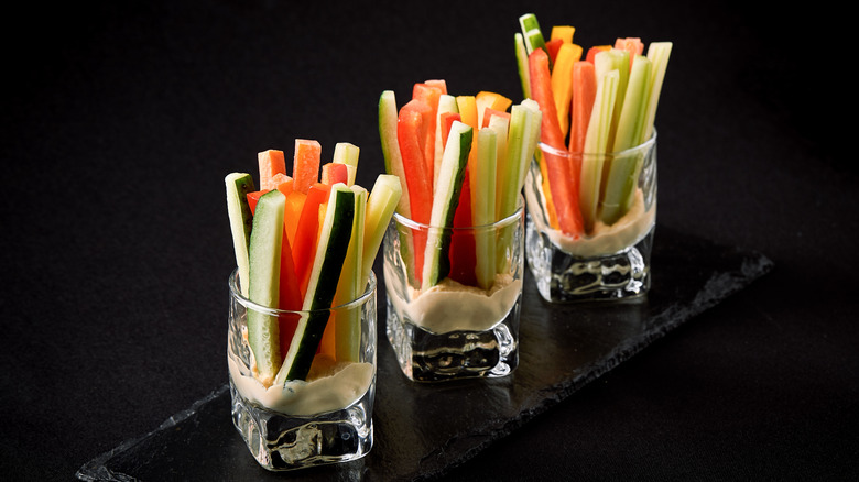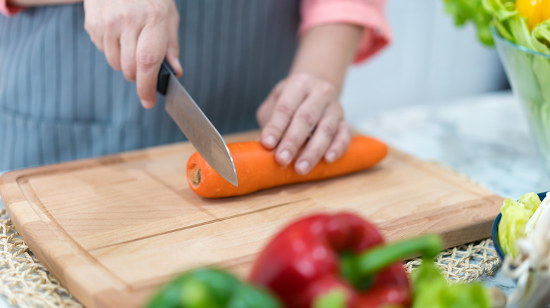 Like any stick cut, you'll want to begin by trimming off the ends of your vegetable, known in chef parlance as "topping and tailing," before peeling your vegetable and squaring it off to form a large rectangle. This squaring-off step allows you to cut even the most misshapen of vegetables into smaller stacks of more uniform rectangles to achieve an even cut — and there are a lot of ways to use up your vegetable scraps.