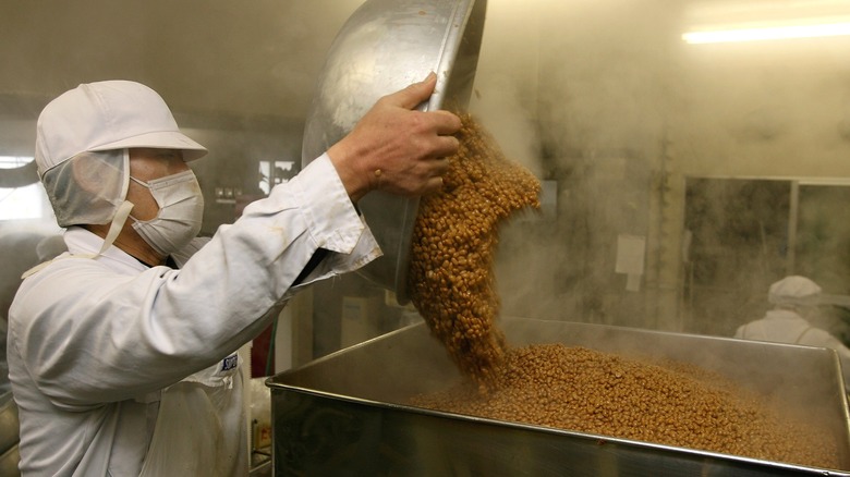 After the soybeans are sorted and washed, they're soaked in water for up to 18 hours. Such a process expands their size and sets up the soybeans for a more even cooking process. Next, the beans can either be boiled or steamed, with the latter method preferred to retain the soy's consistency. Steaming also disinfects the beans, ensuring fermentation takes place smoothly.