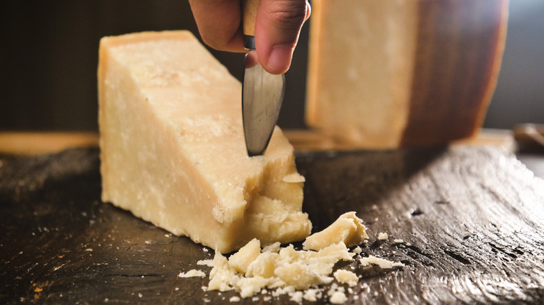 Another trick to distinguish one from the other is to take a knife and scrape the surface of the cheese. If the white part flakes off, it's likely calcium lactate. Mold, however, will probably just fall apart. Cheese crystals will be found on the inside, as well as the outside of the cheese, so if the substance is found only on the surface of the cheese, it's likely to be mold and the cheese should not be eaten. But if it's calcium lactate, it's fine to go ahead and enjoy a piece of that deliciously aged hard cheese.