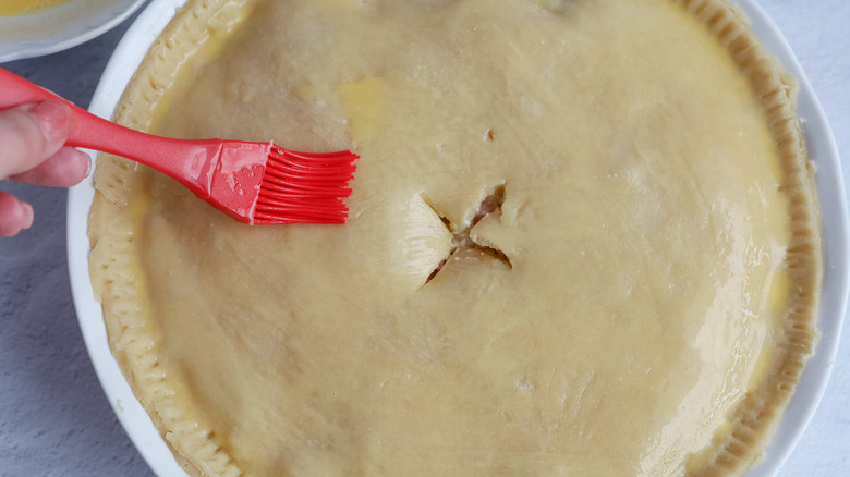 Now, crack the last egg into a small bowl and whisk in 1 tablespoon of water. Use a pastry brush to coat the pie crust with the egg wash. Finally, slice a small X-shape in the middle of the pie. This will give the steam somewhere to exit as the pie bakes.