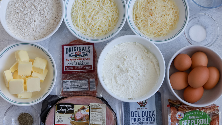 For this recipe you'll need all-purpose flour, cold butter (cubed), large eggs, kosher salt, and cold water. This three-cheese concoction consists of part-skim ricotta, shredded mozzarella, and freshly grated Parmesan. A bit of ground pepper adds a punch of flavor to season the filling. Finally, four types of meat play a leading role in the pie: smoked ham, Genoa salami, pepperoni, and prosciutto. Dice the ham, salami, and pepperoni before you begin.