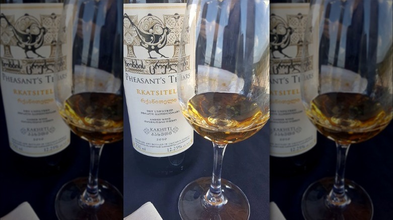 Rkatsiteli is one of Georgia's primary white grapes and a common candidate for local orange wines. Pheasant's Tears' take is complex and savory, with notes of citrus and dried rinds. Due to its extended maturation in a qvevri, the wine displays an oxidative style that adds a layer of nuttiness. With tannins reminiscent of a strong cup of tea and stonefruit aromas, this is a multifaceted bottle. It pairs nicely with eastern European or Middle Eastern cuisines, or serve it with lamb, charcuterie, cheese, or a poultry dish.