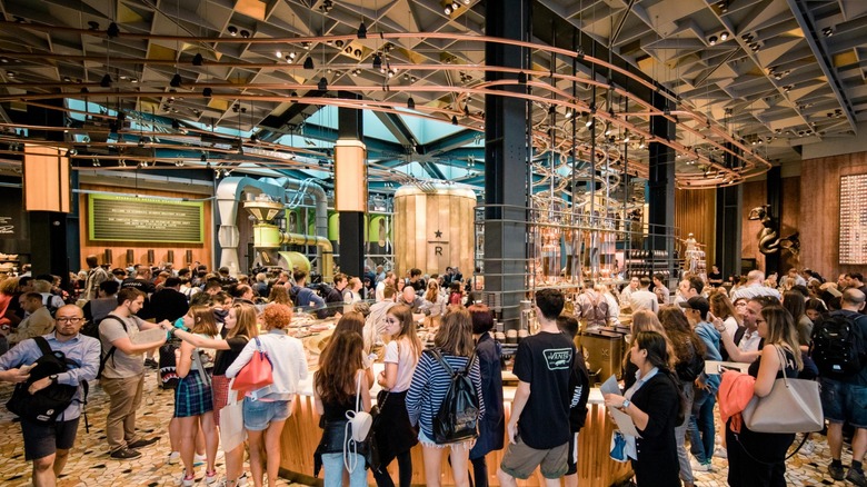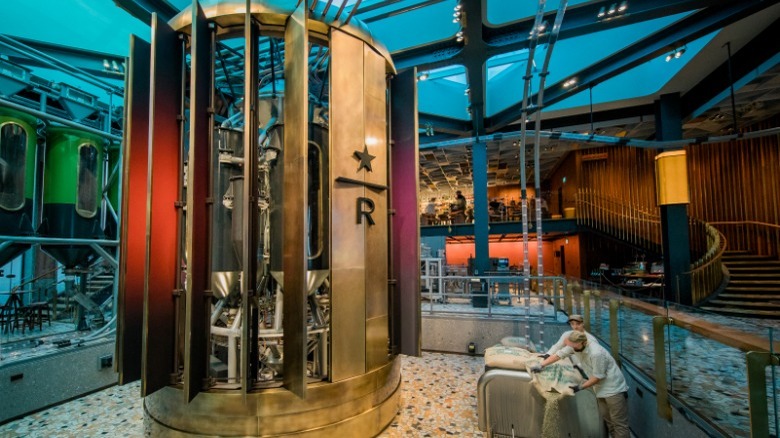 Spanning an impressive 25,000 square feet, the Roastery provides not only coffee drinks but also plenty of entertainment to visitors. Parked in the middle of the store sits a 22-foot-tall cask that roasts coffee beans. When the bronze folds open, customers can see for themselves how Starbucks' coffee is processed. Dubbed the "dancing lady" by team members, this behemoth of an installation is one of many eye-catching features inside the Roastery.