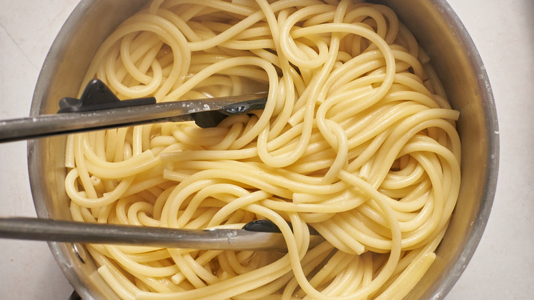 We're not sure about you, but when we were kids, our pasta was served as a mound of spaghetti with the sauce on top and the cheese was grated on generously at the table (or rather, shaken out of green plastic containers). Maybe that's the best way to serve pasta to kids — since after all, every sibling has a different sauce preference — but the truth is, pasta is best served already sauced, with the cheese already melted in. Toss the cooked bucatini with the stewed tomatoes, coating the pasta completely. As you toss, splash reserved pasta water over the noodles to loosen the sauce and help it stick. You don't have to use the entire cup of water and may only need a few splashes, but it doesn't hurt to have extra.