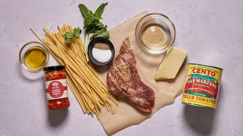 Gather the ingredients for traditional bucatini all'Amatriciana