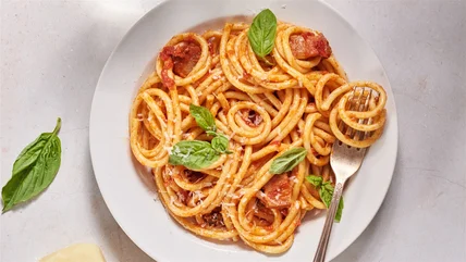 - While the tomato sauce is cooking, cook the bucatini to package directions for al dente, about 7-9 minutes, salting the pasta water generously while it boils. Reserve 1 cup of pasta water, then drain.