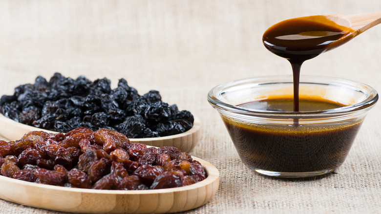 Grapes — when not eaten fresh, they're most infamously processed into wine or vinegar. However, in Mediterranean countries, other grape extracts are popular too. The first step of wine-making is the production of grape must, which is a pressed juice that contains the fruit's seeds and stems. While this thick liquid is more frequently fermented into wine, it's also consumed on its own. With around 15% sugar content, it's sweet and tasty, but not particularly stable. So to improve shelf-life, it's reduced down to around a third of its volume, and voilà — grape molasses is created.