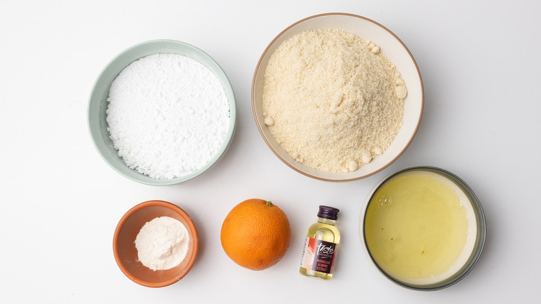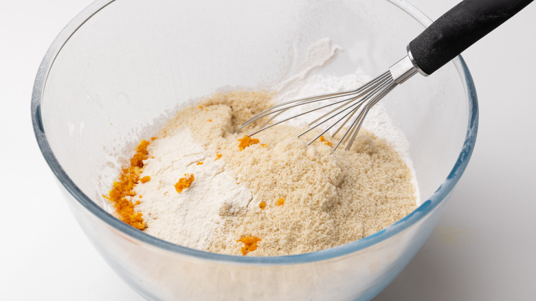- In a large bowl, combine the almond flour with 1 ⅓ cups of sifted confectioner's sugar, the plain flour, the orange zest, and the almond flavoring.