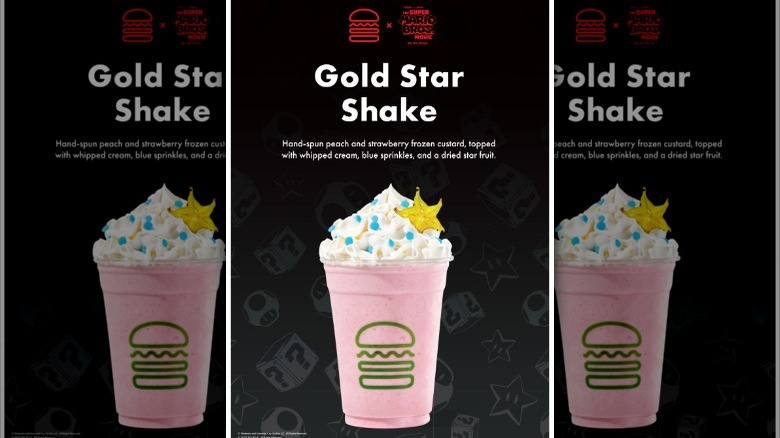 Per a press release sent to Tasting Table, the 'Shroom burger is a fried portabella mushroom, filled and loaded with four different cheeses (cheddar, muenster, fontina, and parmesan). The whole thing is topped with pepperoni and arugula and slathered in Shake Shack's Calabrian chili tomato Fire Sauce. Thirsty after your burger? Shake Shack pretty regularly switches up its shake flavors, but the Gold Star Shake is no ordinary custard treat — it has a dried star fruit garnish. The shake is pink-swirled peach and strawberry with blue sprinkles and whipped cream. A Mario-themed meal isn't the only treat in store for fans, either. On all three days of the promotion, the first 100 customers to visit the DUMBO Shake Shack will receive a free Mario Bros.-inspired swag bag filled with apparel and gear.