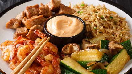 If you're new to Hibachi dining, the first thing you should know is you might be sitting with strangers. A typical Hibachi dining table features a large grill or griddle with numerous seats on three sides. Diners face the grill and the chef behind it. If your group is large, you may have the entire table to yourself. But if not, you will likely be seated with another party. A server will greet you, bring menus, and take your drink orders. While you can order your meal a la carte, many people take advantage of pre-set, multi-course menus, which typically include a soup, salad, steamed or fried rice, vegetables, and your choice of meat, chicken, and/or seafood. The fried rice, veggies, and meats are prepped and cooked on the griddle in front of you via sautéing and searing methods.